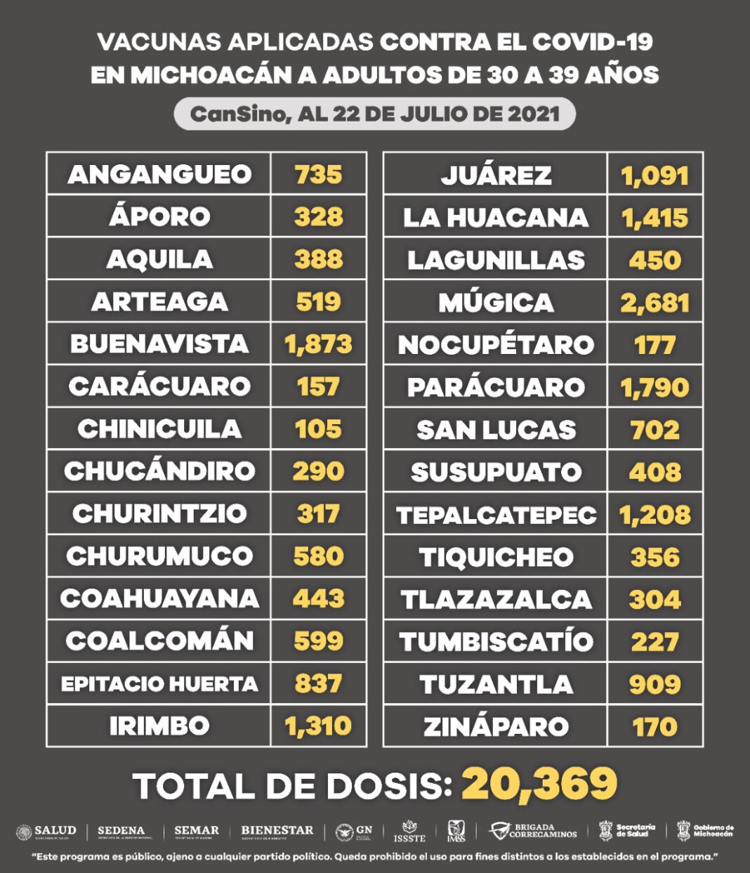 Hasta el momento, en Michoacán han sido aplicadas 201 mil 508 vacunas anti COVID-19, a personas de 30 a 39 años de edad, pertenecientes a 73 municipios.