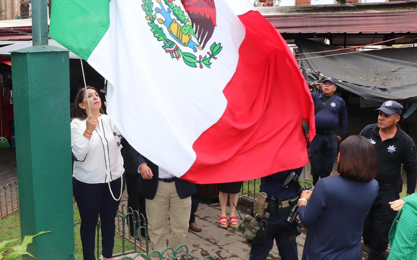 La presidenta municipal de Quiroga, Alma Mireya, encabezó este viernes el izamiento de la Bandera en la sede del Palacio Municipal, de cara a los festejos patrios que tendrán lugar este fin de semana.