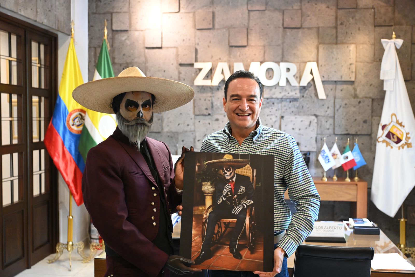 Con motivo del aniversario de la Revolución Mexicana y en reconocimiento al apoyo brindado por el presidente Carlos Soto Delgado al arte y la cultura local, el artista zamorano Édgar Iván Maravilla entregó una de sus más recientes obras, titulada “El charro vuelve a casa”, al mandatario municipal. La pintura marca también el cierre de su exitosa exposición “Los Catrines”, que ha estado en exhibición durante los últimos cinco años.