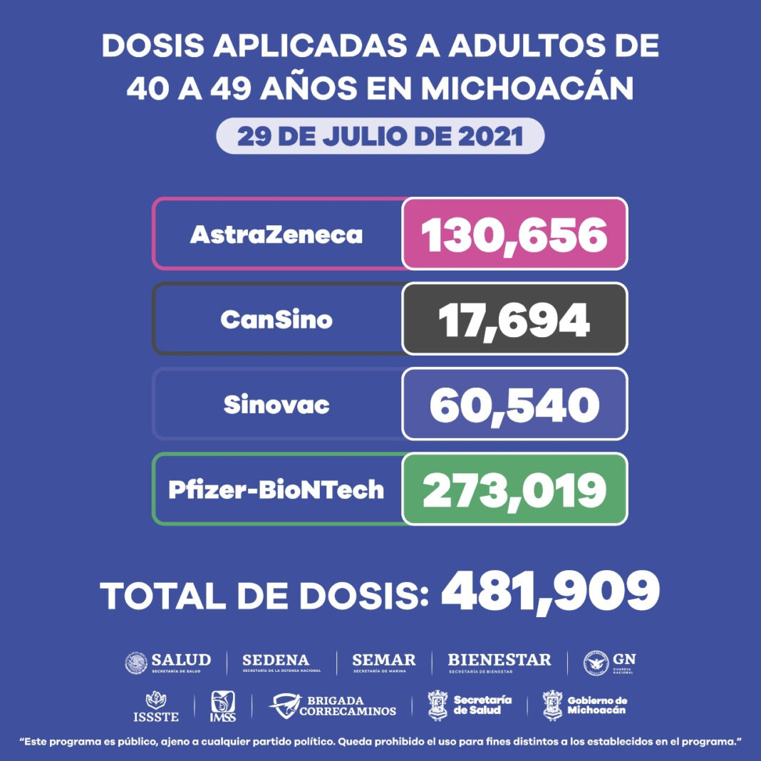 En la entidad, se han aplicado 481 mil 909 dosis de vacuna anti COVID-19 a personas de 40 a 49 años de edad, informa la Secretaría de Salud de Michoacán (SSM).