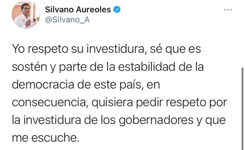 “Presidente, no es Silvano, es la seguridad nacional. Yo respeto su investidura, sé que es sostén y parte de la estabilidad de la democracia de este país, en consecuencia, quisiera pedir respeto por la investidura de los gobernadores y que me escuche”, se lee en su cuenta de Twitter (@Silvano_A).