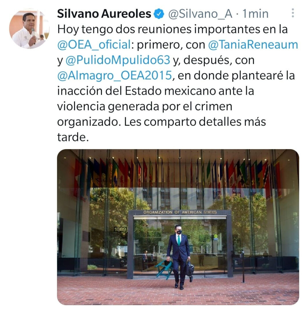 @PulidoMpulido63 y, después, con @Almagro_OEA2015, en donde plantearé la inacción del Estado mexicano ante la violencia generada por el crimen organizado. Les comparto detalles más tarde”, se lee en la red social.